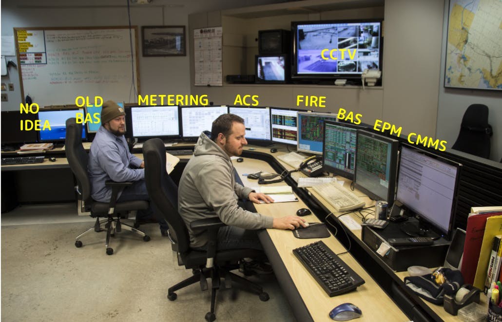 Uh, we have a really great meme that we used to produce a lot off to dig it up and like put it in the show notes here, but it's like, it's a, for lack of better term, facility management basement. And there's these two gentlemen sitting in this room and there's like. Nine screens around them, right? There's the BMS, there's the old BMS, there's the elevator control, there's security, there's CCTV, and the concept of the single pane of glass is that there's no longer this room with nine different screens and you're able to like have that on one platform.