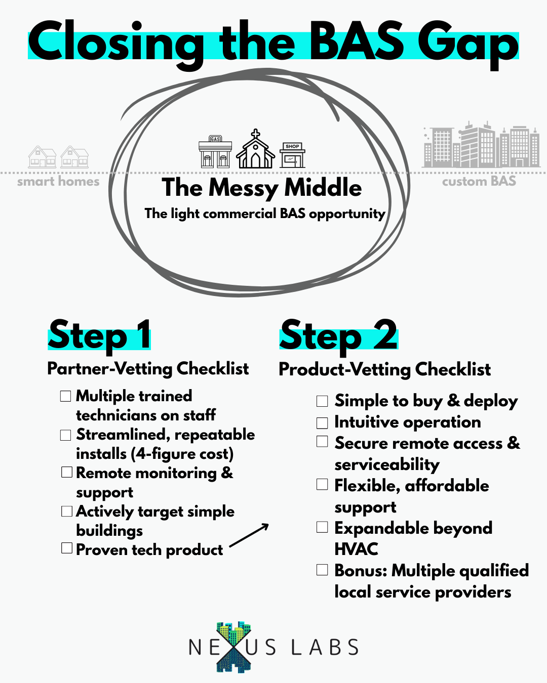 Before diving into how to vet a partner, I wanted to understand whatâs new since The Untapped 87% was published. We talked to four leaders familiar with light-commercial BAS efforts, and each highlighted a piece of the puzzle.Â